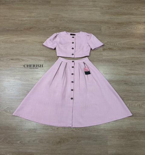 ชุดเซตที่สุดของความคลาสสิค ตัวเสื้อครอปคอกว้างแขนสั้นตกแต่งกระดุม