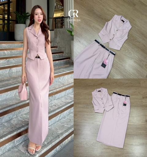 ชุดเซ็ท 3 ชิ้น เสื้อ+กระโปรง+เข็มขัด ตัวเสื้อกั๊กลายริ้ว แขนกุดคอวี