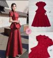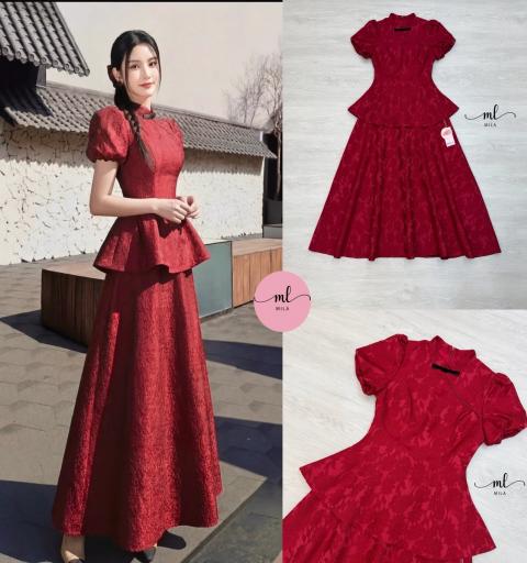 𝐃𝐞𝐭𝐚𝐢𝐥 : ชุดเซต 2 ชิ้น สีแดงผ้า Jacquard เกรดพรีเมียม ทอลายดอกไม้ในตัว เนื้อสัมผัสมีมิติ เงางาม เสื้อทรงคอจีนแต่งโบว์ดำสุดคลาสสิก แขนตุ๊กตาพองสวย เพิ่มความหวานด้วยชายระบาย (Peplum) ที่ช่วยเน้นเอวและพรางสะโพกให้ดูหุ่นดี มาพร้อมกับกระโปรงยาวทรงเอ (A-Line) บานสวยอย่างเป็นธรรมชาติ มีซิปซ่อนด้านหลังทั้งเสื้อและกระโปรง สวมใส่ง่าย มีซับในอย่างดีลุคนี้ให้ความรู้สึกสวย สุภาพ ภูมิฐานแบบลูกคุณหนู จะใส่แยกแมตช์หรือใส่เข้าเซตก็ปังสุด