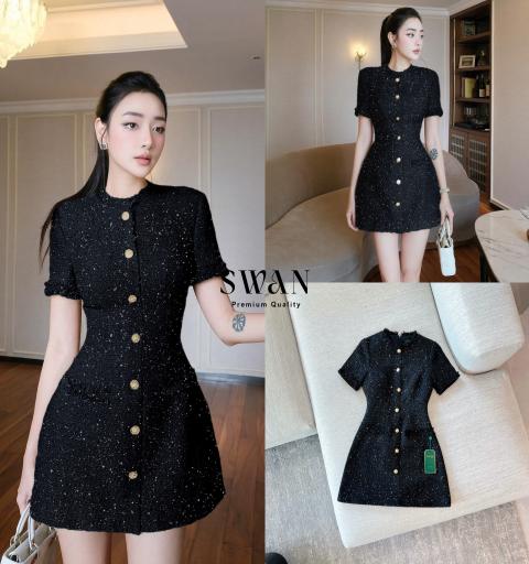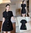 มินิเดรสผ้าทวิตสีดำ แต่งตัดด้วยกระดุมหลอกสีทอง ซิปหลังใส่ง่าย