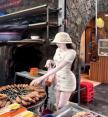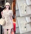 เดรสทวีดสีขาวครีมแขนสั้นทรงเข้ารูปดีไซน์กระดุมหน้าแต่งกระเป๋าหลอกเพิ่มลูกเล่น