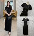 เดรสยาวคอกลม แขนสั้นทรงตุ๊กตา เพิ่มความโดดเด่นด้วยสร้อยสีทองรอบคอ ช่วงเอว