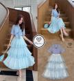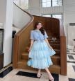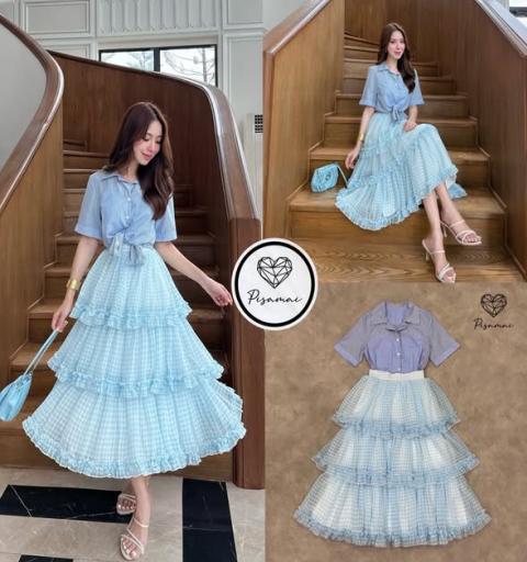เซ็ตเสื้อเชิ้ตคอปกสีฟ้า มาคู่กับกระโปรงลายสก็อตสีฟ้าชั้นฟู สวยฟูฟ่อง