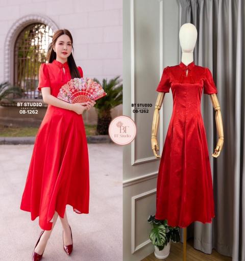 เดรสแต่งปกคอจีนเว้ากลางอกเล็กน้อยแต่งกระดุมพู่จีน แขนสั้น