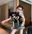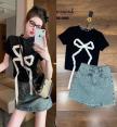 เสื้อ+กระโปรง.กางเกง เสื้อสีดำเนื้อผ้าร่อง ดีเทลด้านหน้าแต่งรูปโบว์ตั๊กล๊ากก