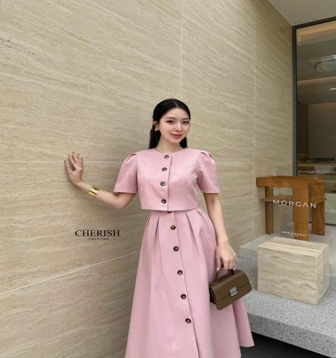 ชุดเซตที่สุดของความคลาสสิค ตัวเสื้อครอปคอกว้างแขนสั้นตกแต่งกระดุม