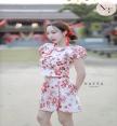 Set 2 ชุด งานผ้าทอลายดอกไม้สีแดง เสื้อแขนตุ๊กตา แต่งดีเทลโบว์ด้านหน้า