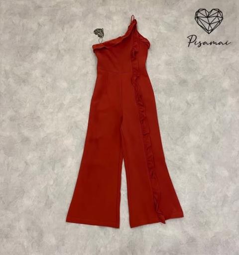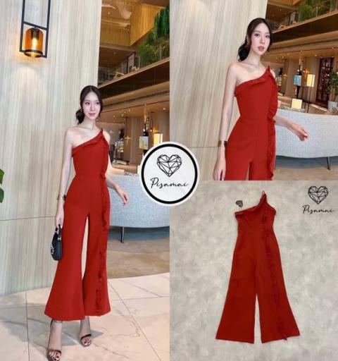 จั้มสูทไหล่เดียวขายาวสีแดงอมส้มแต่งดีเท็ลระบาย มาในดีไซน์เรียบหรู