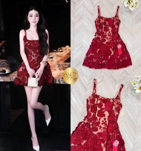เดรสสายเดี่ยว คอเหลี่ยม เนื้อผ้าลูกไม้ เย็บดอกไม้ป๊อปอัพมาทั้งตัว ซิปหลัง