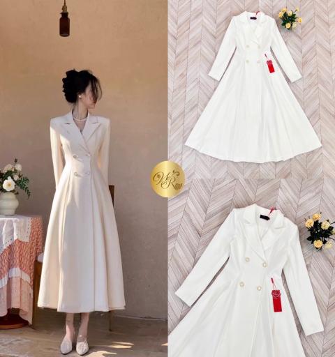 เดรสสูทตัวยาวสวยทรงเก๋ ท่อนแขนยาว ด้านหน้าแต่งกระดุมสีทอง คอปกสวย