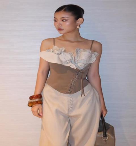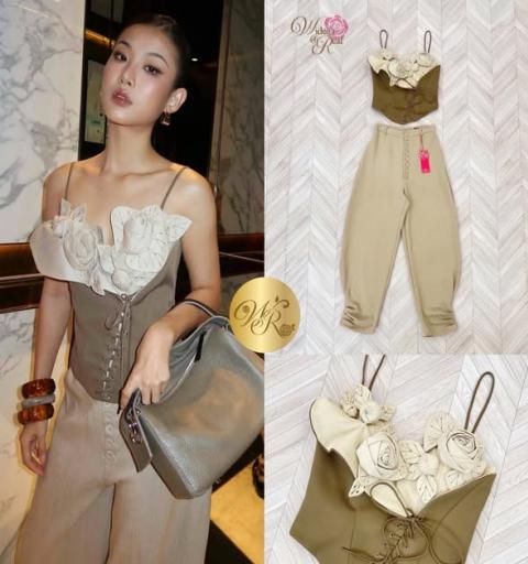 เซ็ทเสื้อกับกางเกงขายาวทรง Baggy สุดเก๋ ตัวเสื้อสายเดี่ยวเก๋ด้วยการแต่งงานดอกไม้สวย Pop up เก๋มาก