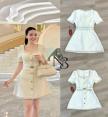 เดรสแขนสั้นผ้าทวิตทรงกระโปรงบาน ดีไซน์แต่งเพรช แต่งกระดุมสีทองด้านหน้า