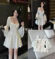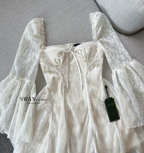 เดรสแขนยาวผ้าลูกไม้โทนครีม ดีไซน์คอเหลี่ยมพร้อมเชือกผูกอกเพิ่มความหวานละมุน ตัวเดรสเข้ารูปช่วงเอวช่วยเก็บทรงให้ดูเพรียว