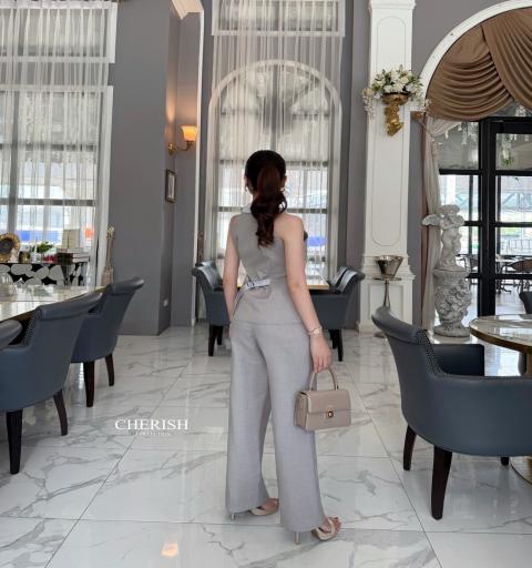 ชุดเซ็ทสุดหรู ดูแพง ตัวเสื้อคอปกแต่งขอบสีเทาซิลซาตินมาพร้อมกระเป๋าใช้งานได้จริงช่วงเอวก็สามารถปรับให้เข้ารูปได้