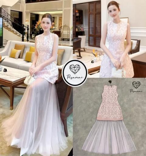 เดรสแขนกุดตัวยาวงานลูกไม้ฉลุสีชมพูตัวสั้น ต่อชายซีทรูคลุมตัวยาว