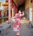 เดรสกี่เพ้าคอจีนดีไซน์แต่งเว้าและมีกระดุมกุ๊นขอบสีแดงสวยหรู ไฮไลท์ที่ชูความโดดเด่นคือเป็นผ้าทอ