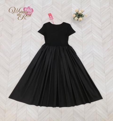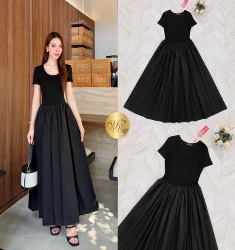 เดรสตัวยาว แขนสั้น ช่วงบนเป็นผ้ายืด ช่วงข้างลำตัวรูดซิป กระโปรงทรงบาน