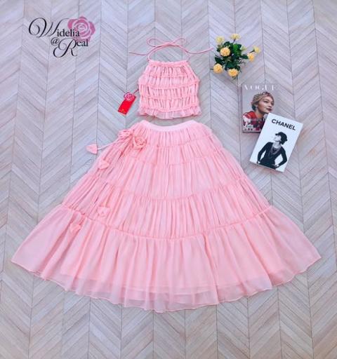 Set เสื้อคล้องคอกับกระโปรงยาว เย็บเอกไม้ด้านข้าง เนื้อผ้าสีพื้น เย็บจีบย่นมาทั้งตัว