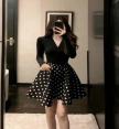 ⚜️Ready to shipping ⚜️Label :: RAMI-PAPHA(รมิปภา) เสื้อยืดสีดำคอวีแขนยาว เนื้อผ้ายืดหยุ่นหนานุ่มเก็บทรงอย่างดี ช่วงไหล่สวยเก๋ ++กระโปรงสีดำลายจุด Polka Dot ทรงสวย ซับในอย่างดีทั้งตัว ซิปหลัง