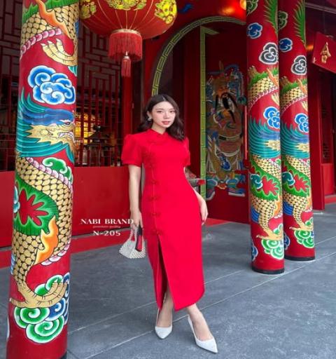เดรสสีแดงแขนสั้น ดีไซน์แต่งด้วยกระดุมจีนไข่มุกแทบด้านหน้า มีผ่านด้านหน้าขอบเล็มด้วยกุ้นขอบจีน