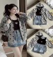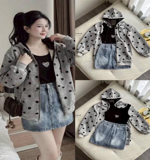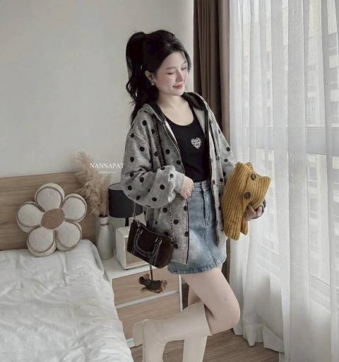 ดีไซน์ลายจุด (Polka Dot) สุดคลาสสิกบนพื้นสีเทา ให้ลุคกึ่งสปอร์ตแต่ยังดูเฟมินีน