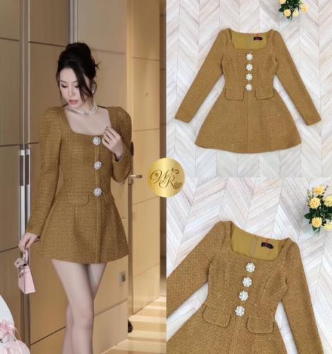 เดรสแขนยาว คอเหลี่ยม อกแต่งเข็มกลัดเพชร เนื้อผ้าทวิต แต่งกระเป๋าหลอก