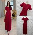 เดรสยาวคอกลม แขนสั้นทรงตุ๊กตา เพิ่มความโดดเด่นด้วยสร้อยสีทองรอบคอ ช่วงเอว