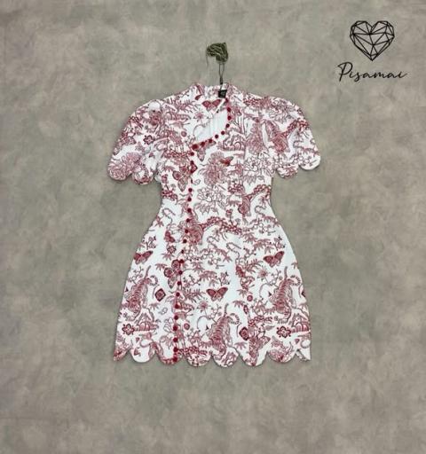 เดรสกี่เพ้าทรงแขนตุ๊กตาแต่งขอบหยักมาในลายกราฟฟิกตรุษจีน