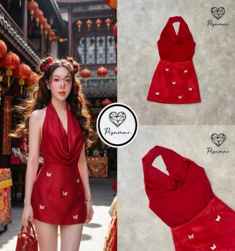 เซ็ตเสื้อคล้องคอผ้ามันคอถ่วงสีแดงมาคู่กับกระโปรงสอบตัวสั้นปักผีเสื้อสีทองอร่าม
