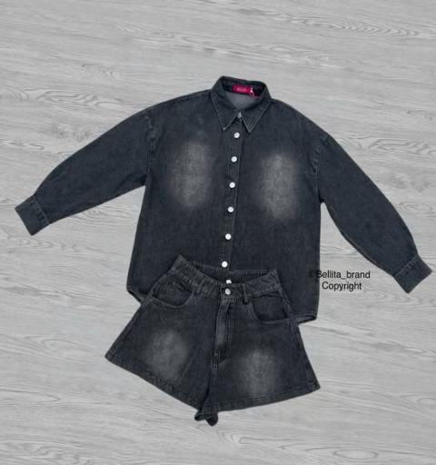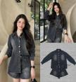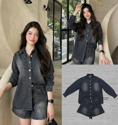 เซตเสื้อ+กางเกงยีนส์สีดำ เสื้อตัวโอเวอร์ไซส์ มีคอปกแขนยาวพองๆ