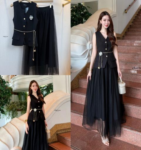 🔺set 4 ชิ้น : เสื้อแขนกุด+กระโปรงมุ้งยาว+ เข็มกลัดดอกไม้+เข็มขัดโซ่