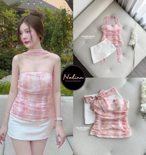 Set 3 ชิ้น เสื้อเกาะอกลายผ้าน่ารัก โทนชมพู ดอกลายปักนูน ซิบหลัง