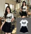เซต 3 ชิ้น ขาว+ดำ เสื้อคอกลมสีขาวแขนสั้นทรงตรงพิมพ์ลายเสื้อในสีดำผูกโบว์