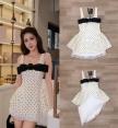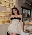 เดรสสายเดี่ยวลายจุดทรงเข้ารูป อกแต่งโบว์สีดำใหญ่สะดุดตา
