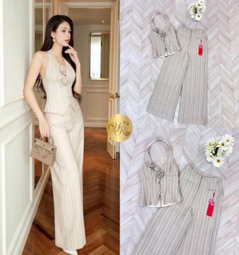 Set เสื้อคล้องคอกับกางเกงขายาว เอวสูง เสื้อเย็บดอกกุหลาบป๊อปอัพ
