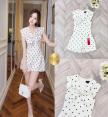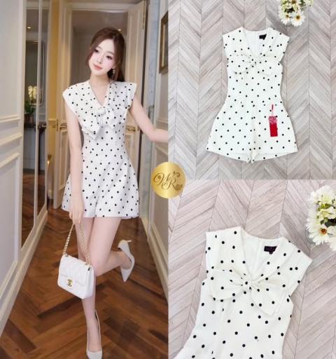 จั้มสูทขาสั้น แขนกุด คอปกพับ อกเย็บโบว์ เนื้อผ้าพิมพ์ลายจุด