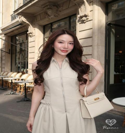 เดรสสีครีมแขนกุดคอปกตัวยาวเป็นทรงซิปหน้า สวย หรู