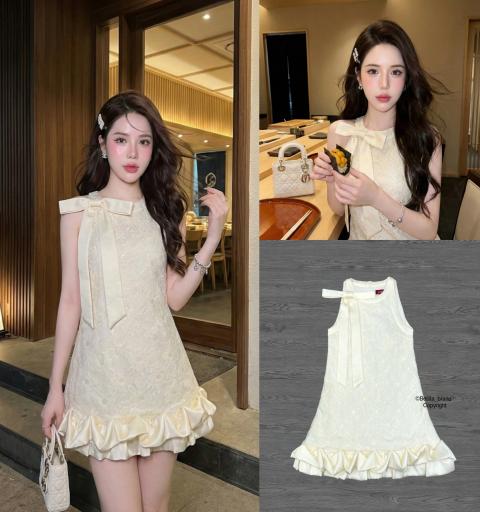 Bellita    คอกลมแขนกุด แต่งโบว์สีครีม ทรงตรงปลายกระโปรงบาน  [พร้อมส่ง]