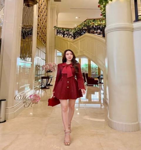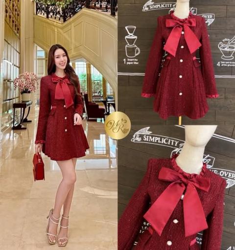 เดรสแขนยาวตัวสั้นสวยตัวเดรสมาในผ้าทวิตเนื้อสวย รอบคอจีบระบายสวย