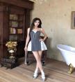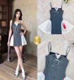 เดรสสายเดี่ยว อกผูกโบว์ แต่งกระดุมหน้า ซิปหลัง ตัวเดรสผ้าเรียบสีเทา