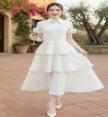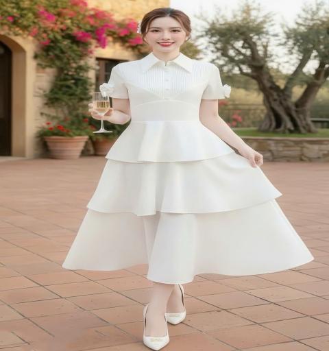เดรสยาวสีขาว คอปกแขนสั้น แต่งอ่ะไหล่กระดุมมุข ใช้งานได้จริง