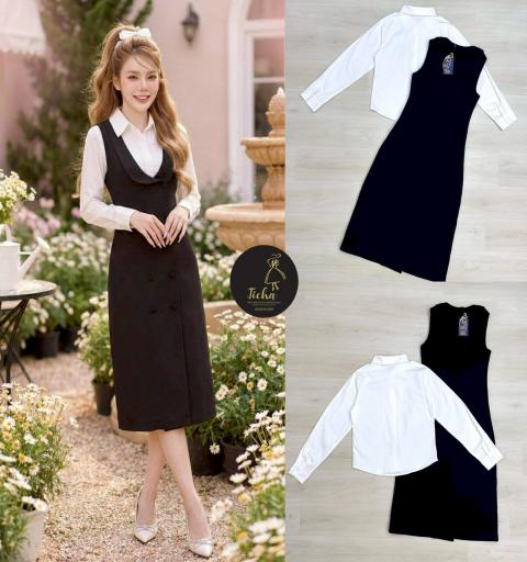 Set 2 ชิ้น เดรสยาว+ เสื้อครอปแขนยาว เดรสยาวสีดำคอปกทรงวี ดีเทลกระดุมหน้ายาว (ใช้งานได้จริง)