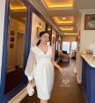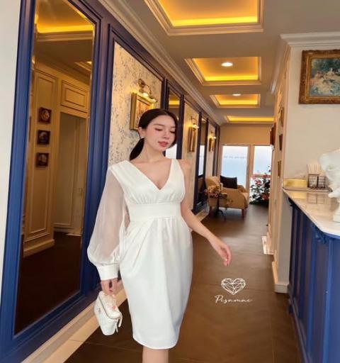 เดรสคอวีสีขาวทรงแขนกุด อีกด้านแต่งแขนยาวซีทรูผ่าทรงสอบ 5 ส่วน