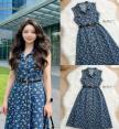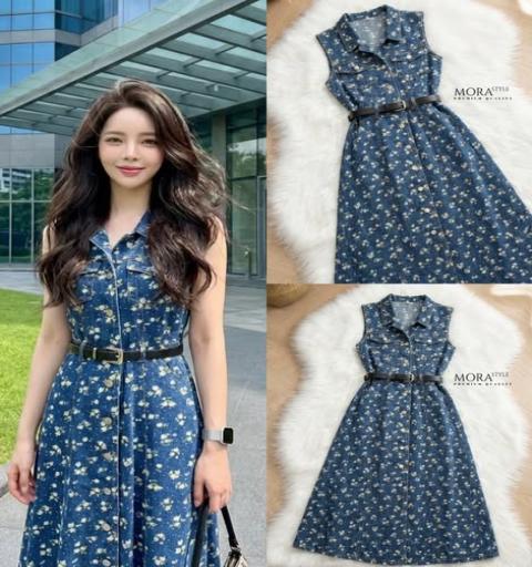 เดรสยีนส์คอปกแขนกุดตัวยาว งานกระดุมด้านหน้า แต่งลายดอกทั้งชุด