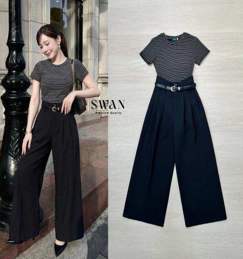 Detail : Set 3 ชิ้นโทนดำคลาสสิก เสื้อยืดแขนสั้นลายทางขาว-ดำทรงพอดีตัวเนื้อผ้านุ่มยืดสบาย ใส่แล้วเก็บทรงสวย แมตช์กับกางเกงขายาวเอวสูงทรงขากว้างทิ้งตัวพลิ้วช่วยพรางต้นขาและเสริมลุคให้ดูสูงเพรียว พร้อมเข็มขัดหนังสีดำหัวทองเพิ่มดีเทลหรูและเน้นช่วงเอวให้ชัด ได้ลุคมินิมอลเรียบเท่แต่ดูแพง ใส่ทำงาน เที่ยวเมือง หรือคาเฟ่ก็เอาอยู่ในเซ็ตเดียว