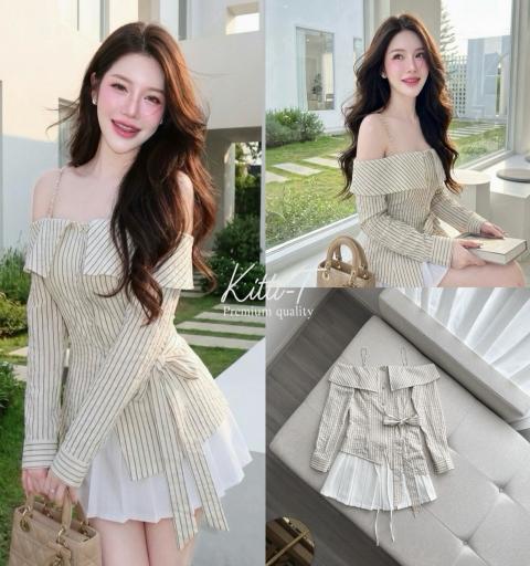 Details : Set ชิ้น คุณหนูที่มีสไตล์และมีความเป็นแฟชั่นนิสต้า เสื้อเป็นทรง เปิดไหล่ ที่มีปกพับขนาดใหญ่รอบช่วงอก เพิ่มเลเยอร์ให้ดูมีมิติ ลายทางแนวตั้ง สีครีม-ดำ ช่วยพรางตาให้รูปร่างดูเพรียวขึ้น แขนยาวทรงเชิ้ตพร้อมกระดุมที่ข้อมือ ให้ลุคที่ดูสุภาพแต่ยังแฝงความขี้เล่น กระโปรงเป็นกระโปรงสั้น อัดพลีท (Pleated Skirt) สีขาวสะอาดตา 💯