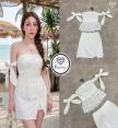 เดรสเกาะอกสีขาวแขนโบว์งานลูกไม้ฉลุ มาคู่กับกระโปรงสอบตัวสั้นสีขาว
