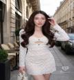 เดรสแขนยาวตัวสั้นสีขาวเว้าเอว ซีทรู งานฉลุลูกไม้ทั้งตัว เรียบ หรู ดูแพง