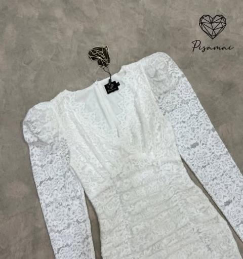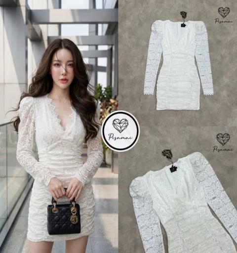 เดรสลูกไม้แขนยาวคอวีตัวสั้นสีขาวฉลุทั้งตัว สวยมากๆค่า
