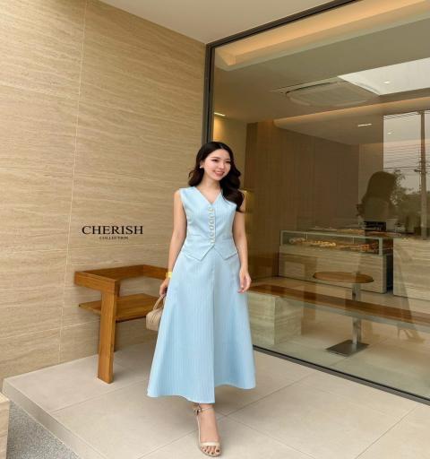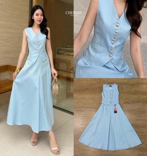 ชุดเซ็ทสุดหรู ดูแพง ตัวเสื้อลายทางตกแต่งกระดุมสุดคลาสสิค
